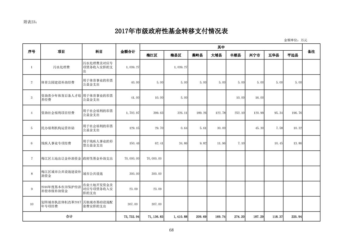 附表23:2017年度市級政府性基金轉移支付情況表