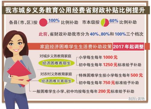 省人民政府日前發布《進一步完善城鄉義務教育經費保障機製的通知》,對城鄉義務教育公用經費比例分擔進行了調整,並統籌家庭經濟困難學生生活費補助政策。其中,我市各縣(市、區)城鄉義務教育公用經費省財政補貼比例為100%,市本級則按60%比例補助。
