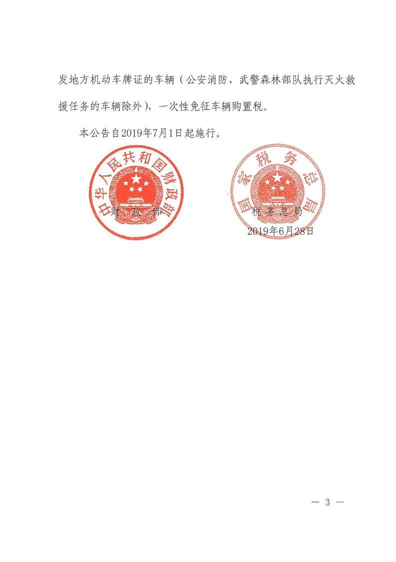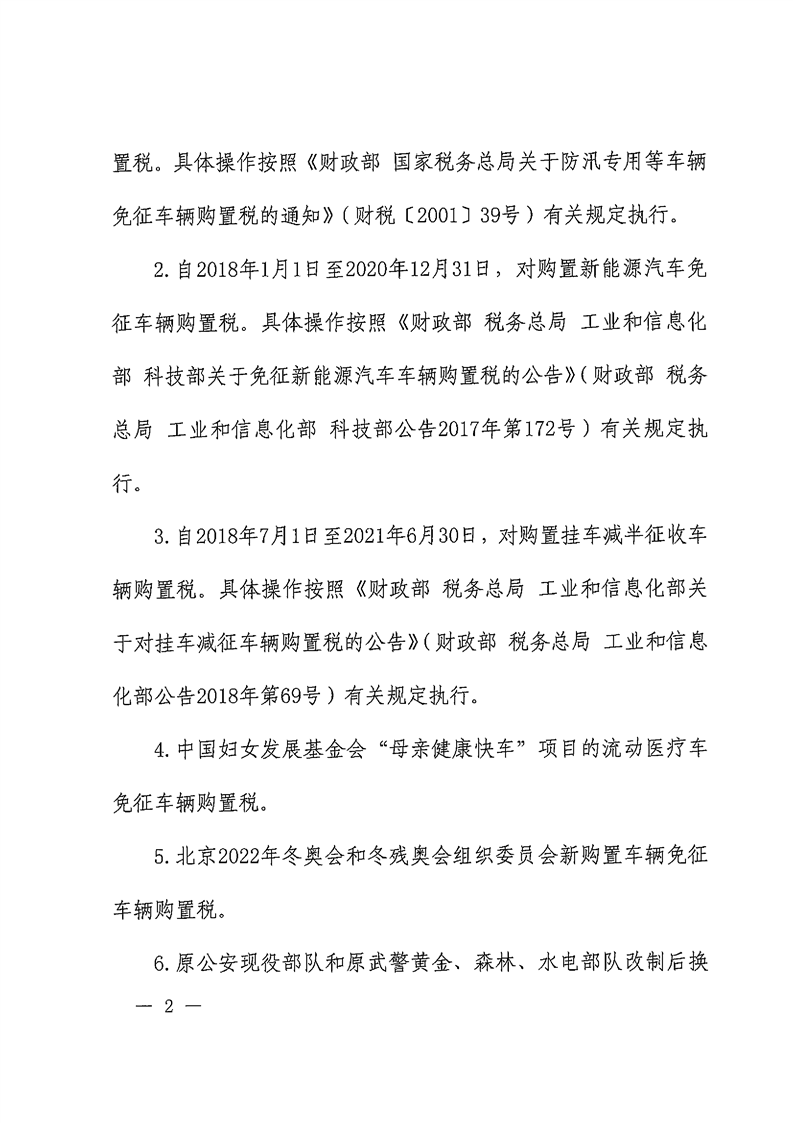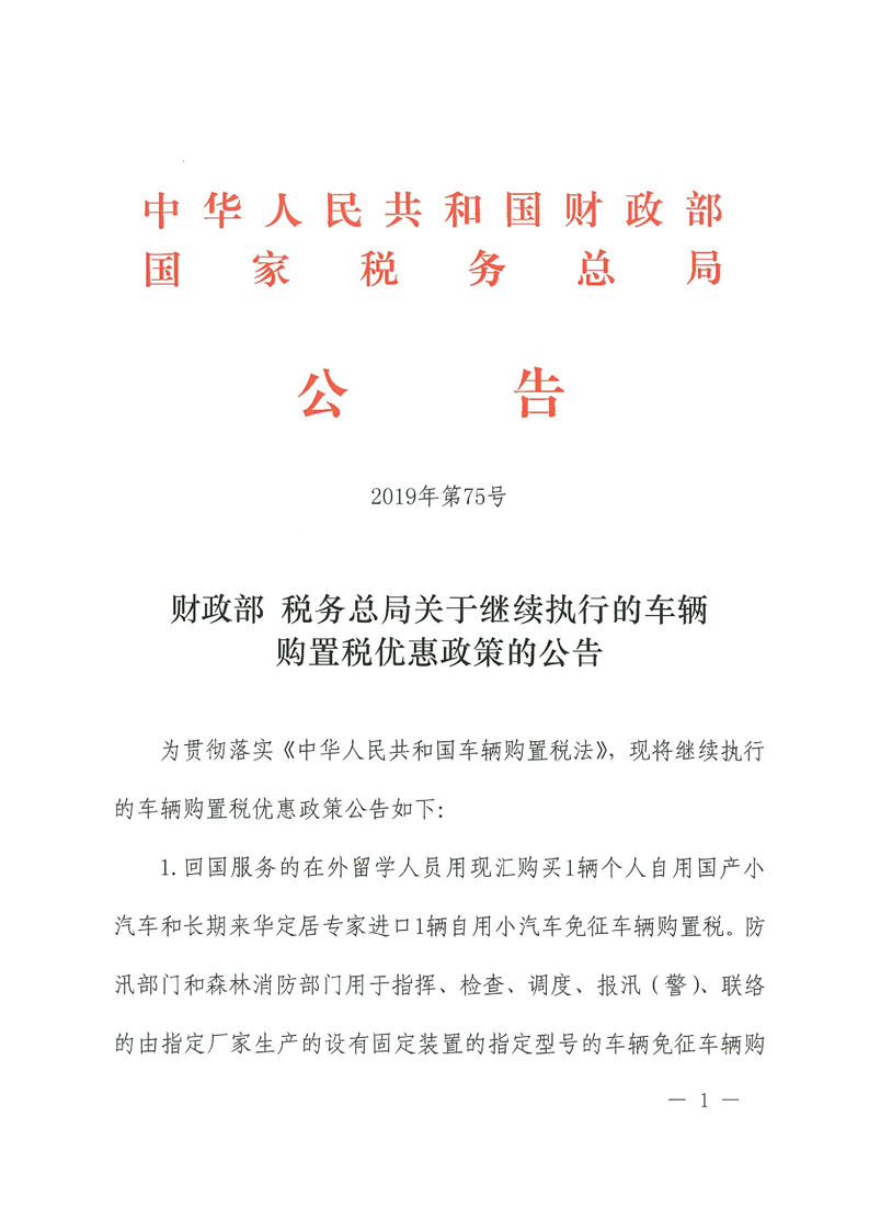 財政部 稅務總局關於繼續執行的車輛購置稅優惠政策的公告