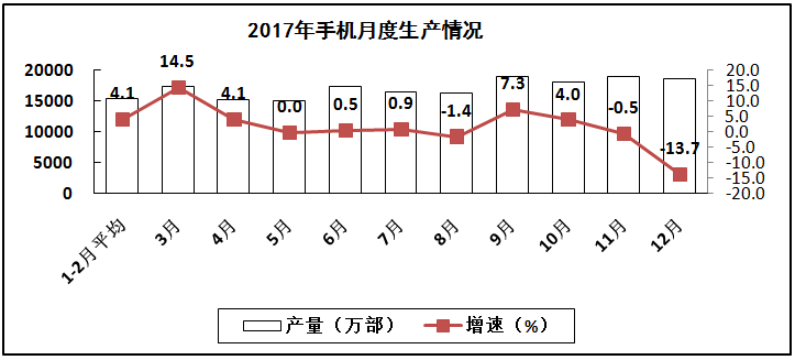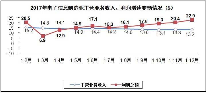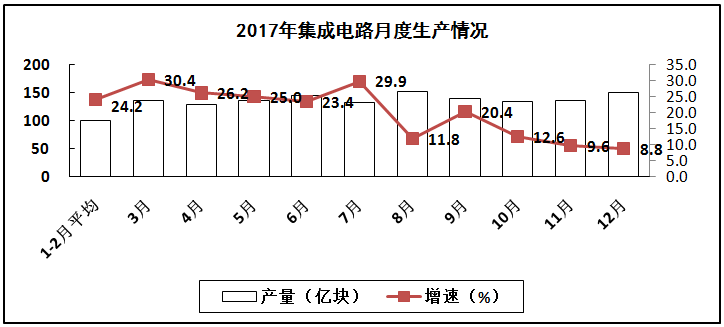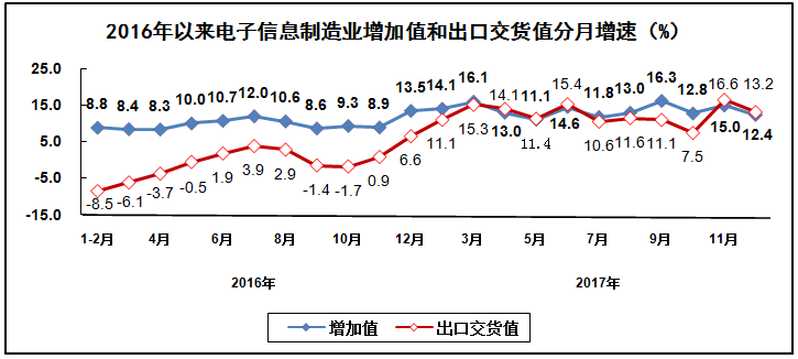生產保持較快增長。2017年,規模以上電子信息製造業增加值比上年增長13.8%,增速比2016年加快3.8個百分點;快於全部規模以上工業增速7.2個百分點,占規模以上工業增加值比重為7.7%。其中,12月份增速為12.4%,比11月份回落2.6個百分點。