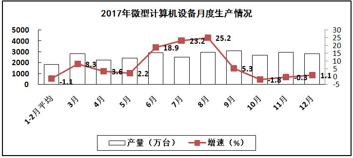 計算機行業生產、出口情況明顯好轉。2017年,生產微型計算機設備30678萬台,比上年增長6.8%(2016年為下降9.6%),其中筆記本電腦17244萬台,比上年增長7.0%;平板電腦8628萬台,比上年增長4.4%。實現出口交貨值比上年增長9.7%(2016年為下降5.4%)。