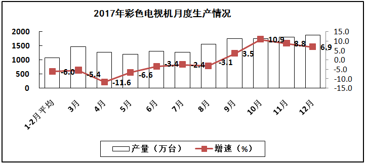 家用視聽行業生產持續低迷,出口增速加快。2017年,生產彩色電視機17233萬台,比上年增長1.6%,增速比2016年回落7.1個百分點;其中液晶電視機16901萬台,比上年增長1.2%;智能電視10931萬台,比上年增長6.9%,占彩電產量比重為63.4%。實現出口交貨值比上年增長11.8%,同比加快10個百分點。