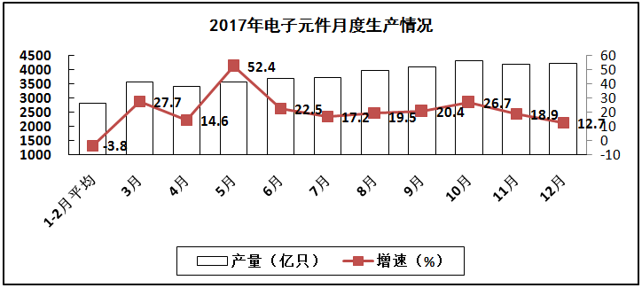 電子元件行業生產穩中有升,出口增速加快。2017年,生產電子元件44071億隻,比上年增長17.8%。實現出口交貨值比上年增長20.7%,增速比2016年加快18.1個百分點。