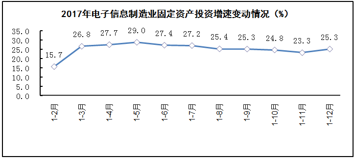 固定資產投資保持高速增長。2017年,電子信息製造業500萬元以上項目完成固定資產投資額比上年增長25.3%,增速比2016年加快9.5個百分點,連續10個月保持20%以上高位增長。電子信息製造業本年新增固定資產同比增長35.3%(2016年為下降10.9%)。