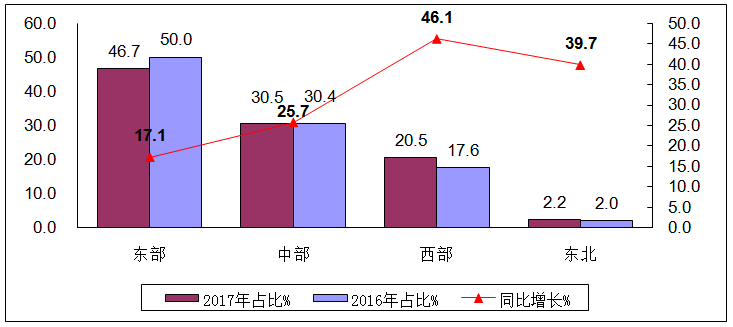 西部地區投資增速領跑,東北地區投資明顯好轉。2017年,東部地區投資增長平穩,完成投資同比增長17.1%,增速比2016年回落1.6個百分點,其中河北、廣東投資增長較快,分別增長46.4%和41.9%;中部地區投資增長較快,完成投資同比增長25.7%,增速比2016年提高11.7個百分點,其中江西、安徽投資增長較快,分別增長76.2%和24.6%;西部地區投資增速領跑,完成投資同比增長46.1%,增速比2016年提高26.3個百分點,其中雲南、貴州、四川投資增長較快,同比分別增長338.9%、120.9%和118.0%;東北地區投資由降轉升,完成投資同比增長39.7%(2016年為下降29.6%),黑龍江、遼寧投資分別增長109.7%和60.8%。