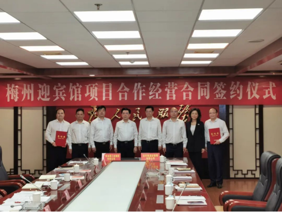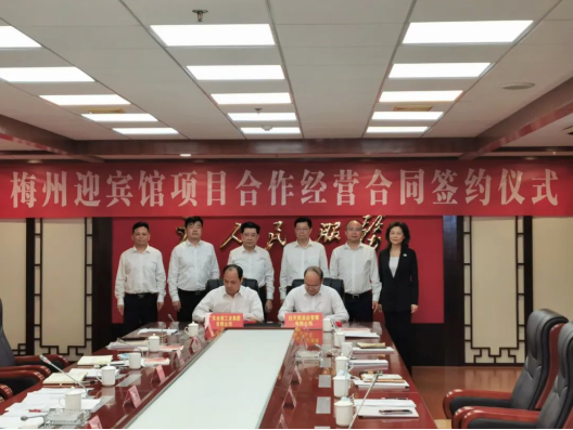 5月6日上午,金雁工業集團與白天鵝酒店管理公司在市政府9樓西會議室舉行梅州迎賓館項目合作經營合同簽約儀式。市委副書記、市長王暉,市委常委、副市長孫春明,市國資委主任吳誌洲以及省旅控集團黨委書記、董事長車持強,省旅控集團黨委委員、副總經理羅乾國、莫曉暉等領導出席並見證簽約儀式。