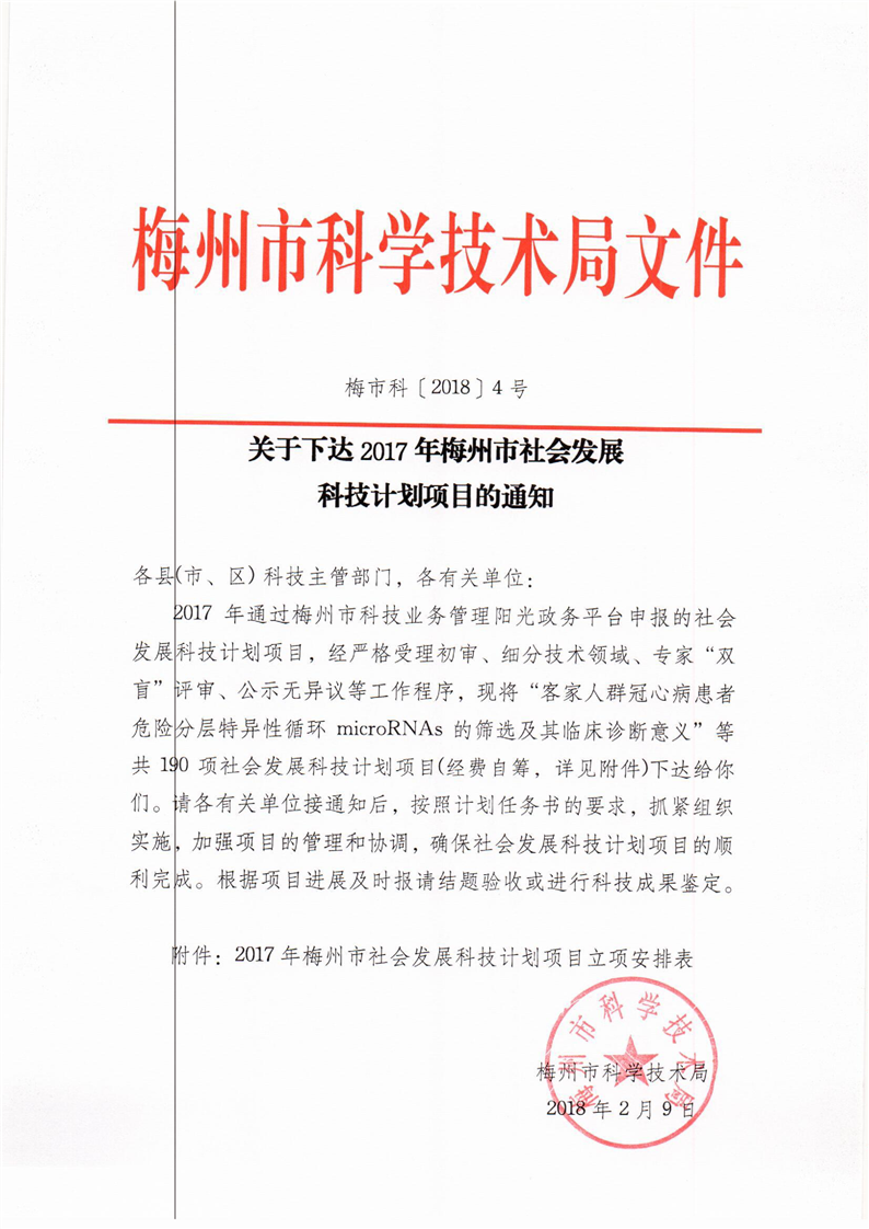 關於下達2017年梅州市社會發展科技計劃項目的通知