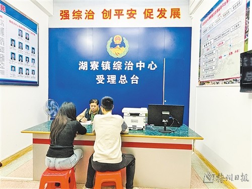 在湖寮鎮綜治中心受理總台,工作人員為當事人提供法律谘詢服務。