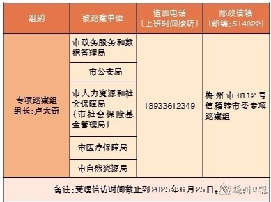 本次專項巡察時間為4月下旬至6月下旬。其間,市委專項巡察組設立專門聯係電話和信箱,主要受理反映涉及亚博网址链接 工作方麵問題的來信來電來訪。受理信訪時間截至2025年6月25日。(市委巡察辦)