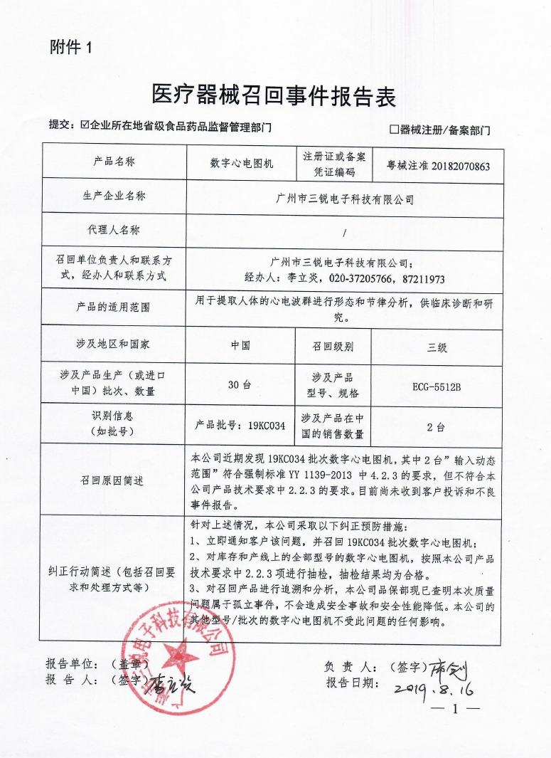 廣州市三銳電子科技有限公司報告,該公司對其生產的數字心電圖機實施主動召回處理,召回級別為三級,涉及產品的型號、規格及批次等詳細信息見《醫療器械召回事件報告表》。