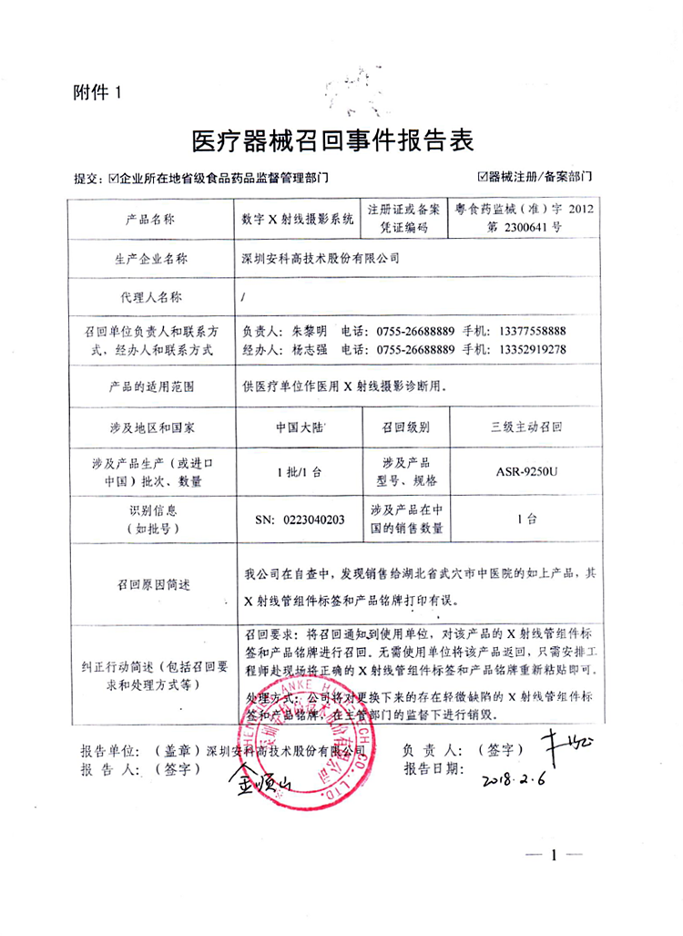 深圳安科高技術股份有限公司報告,由於X射線管組件標簽和產品銘牌打印錯誤等原因,深圳安科高技術股份有限公司對其生產的數字X射線攝影係統(注冊號:粵食藥監械(準)字2012第2300641號)主動召回。召回級別為三級。涉及產品的型號、規格及批次等詳細信息見《醫療器械召回事件報告表》。