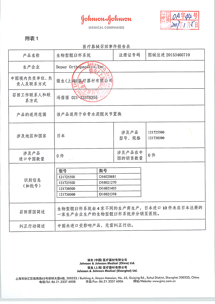 強生(上海)醫療器材有限公司報告,該公司代理的生物型髖臼杯係統(注冊證編號:國械注進20153460710),發現日本進口10件未在日本注冊的一家生產企業生產的生物型髖臼杯係統並分銷至醫院,其生產商DePuy Orthopaedics, Inc.對該產品進行主動召回。該公司稱本次召回產品未在中國銷售。請各省、自治區、直轄市食品藥品監督管理局加強對此類產品的監督管理。