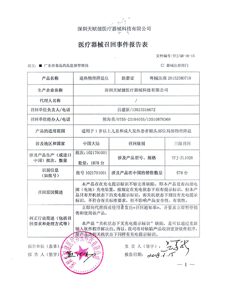 深圳天賦健醫療器械科技有限公司報告,由於產品存在充電提示標識不完善等原因,深圳天賦健醫療器械科技有限公司對其生產的退熱物理降溫儀(注冊號:粵械注準20152580719號)主動召回。召回級別為三級。涉及產品的型號、規格及批次等詳細信息見《醫療器械召回事件報告表》。