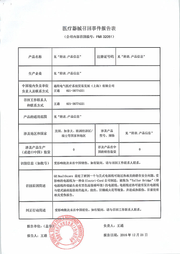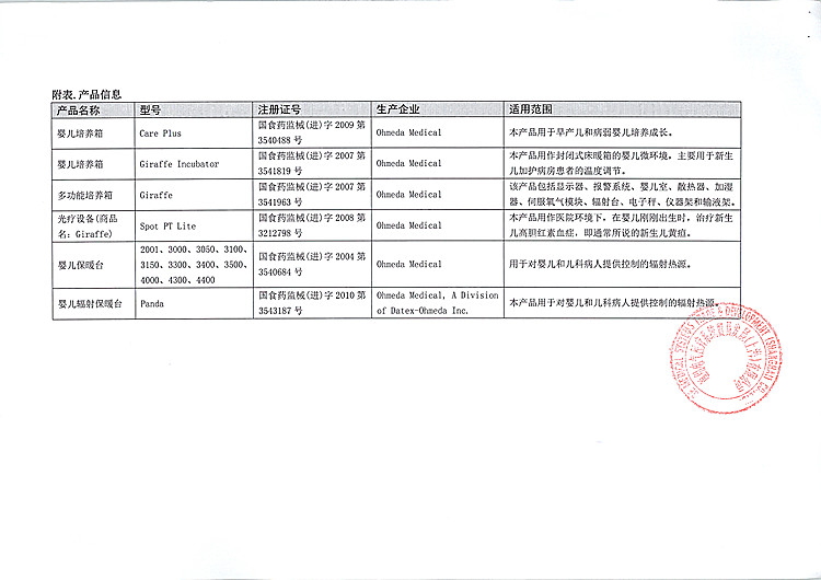 通用電氣醫療係統貿易發展(上海)有限公司報告,該公司代理的嬰兒培養箱(注冊證編號:國食藥監械(進)字2009第3540488號)、嬰兒培養箱(注冊證編號:國食藥監械(進)字2007第3541819號)、多功能培養箱(注冊證編號:國食藥監械(進)字2007第3541963號)、光療設備(商品名:Giraffe,注冊證編號:國食藥監械(進)字2008第3212798號)、嬰兒保暖台(注冊證編號:國食藥監械(進)字2004第3540684號)、嬰兒輻射保暖台(注冊證編號:國食藥監械(進)字2010第3543187號)等產品,發現電源線過熱可能引發在電源線與壁式插座連接處的起火、燒焦、冒煙或火花等現象,並造成熱損傷。其生產商Ohmeda Medical對上述產品進行主動召回,該公司稱本次召回產品未在中國銷售。請各省、自治區、直轄市食品藥品監督管理局加強對此類產品的監督管理。