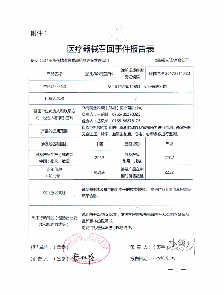 飛利浦金科威(深圳)實業有限公司報告,由於說明書中未公布聲輸出水平的技術數據、附件產品分類信息標簽標識不恰當的風險,飛利浦金科威(深圳)實業有限公司對其生產的胎兒/孕婦監護儀(注冊號:粵械注準20172211780)主動召回。召回級別為三級。涉及產品的型號、規格及批次等詳細信息見《醫療器械召回事件報告表》。