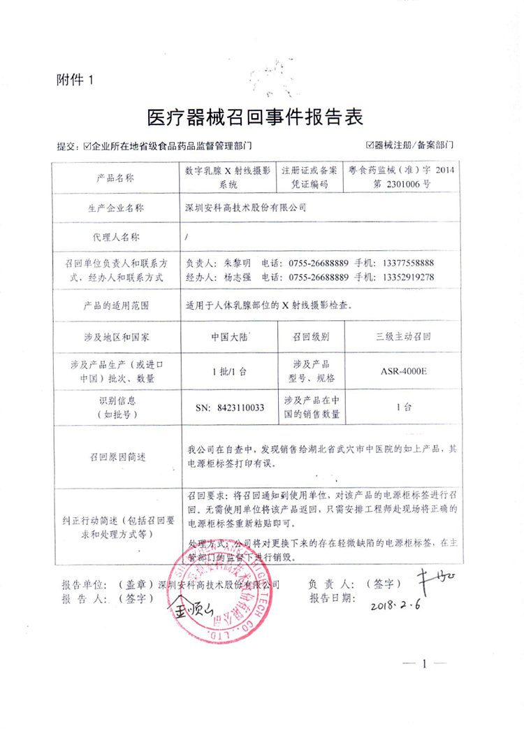 深圳安科高技術股份有限公司報告,由於電源櫃標簽打印錯誤等原因,深圳安科高技術股份有限公司對其生產的數字乳腺X射線攝影係統(注冊號:粵食藥監械(準)字2014第2301006號)主動召回。召回級別為三級。涉及產品的型號、規格及批次等詳細信息見《醫療器械召回事件報告表》。