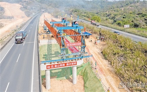 3月21日上午10時,在中鐵十五局汕梅高速改擴建項目TJ2標藍田大橋施工現場,首片20米長的預製箱梁順利架設(如圖,連誌城攝)。這標誌著該項目國高網段的橋梁工程進入上部結構施工新階段。