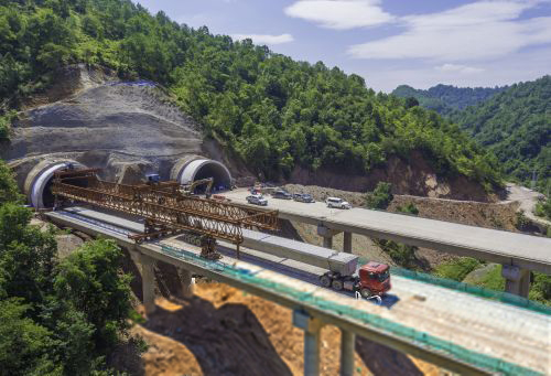 記者在施工現場看到,該架梁點位於梅平高速右洞出口端,預製箱梁的架設完成,為後續的路麵、人子石隧道右洞出口端等的施工創造了有利條件。其中,梅平高速項目關鍵控製性工程人子石隧道預計11月底全幅貫通。