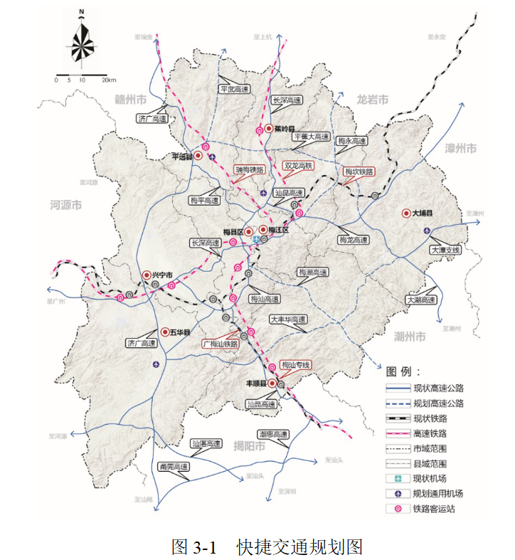 (一)構建輻射周邊、立體快捷的旅遊交通體係。一是打通環線、融入潮汕。結合“兩環十二射”高速公路布局規劃,加快建設連通各縣(市、區)的高速公路環線,重點推動大豐高速、平蕉大高速建設;強化與潮汕平原的交通聯係,加快推進梅潮高速開工建設和梅汕高速改擴建。二是連接雙區、輻射閩粵贛。重點推進梅(州)龍(川)高鐵建設,加快融入“雙區”“雙城”“兩個合作區”2小時經濟圈;立足“省際邊界區”區位,推進瑞梅鐵路、龍(岩)梅(州)高鐵、平武高速開工建設,將梅州建設成為閩粵贛區域性交通樞紐城市。三是加快推進梅州機場遷建工作,繼續優化主要客源地航班航線。進一步提升梅州“航旅聯盟”模式,加強機場、航空公司和文旅企業產品合作開發和聯合營銷,推出便捷平價的“航旅融合”產品,推進“民航大眾化”進程。