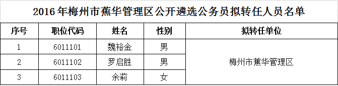 2016年梅州市蕉華管理區公開遴選公務員擬轉任人選公示