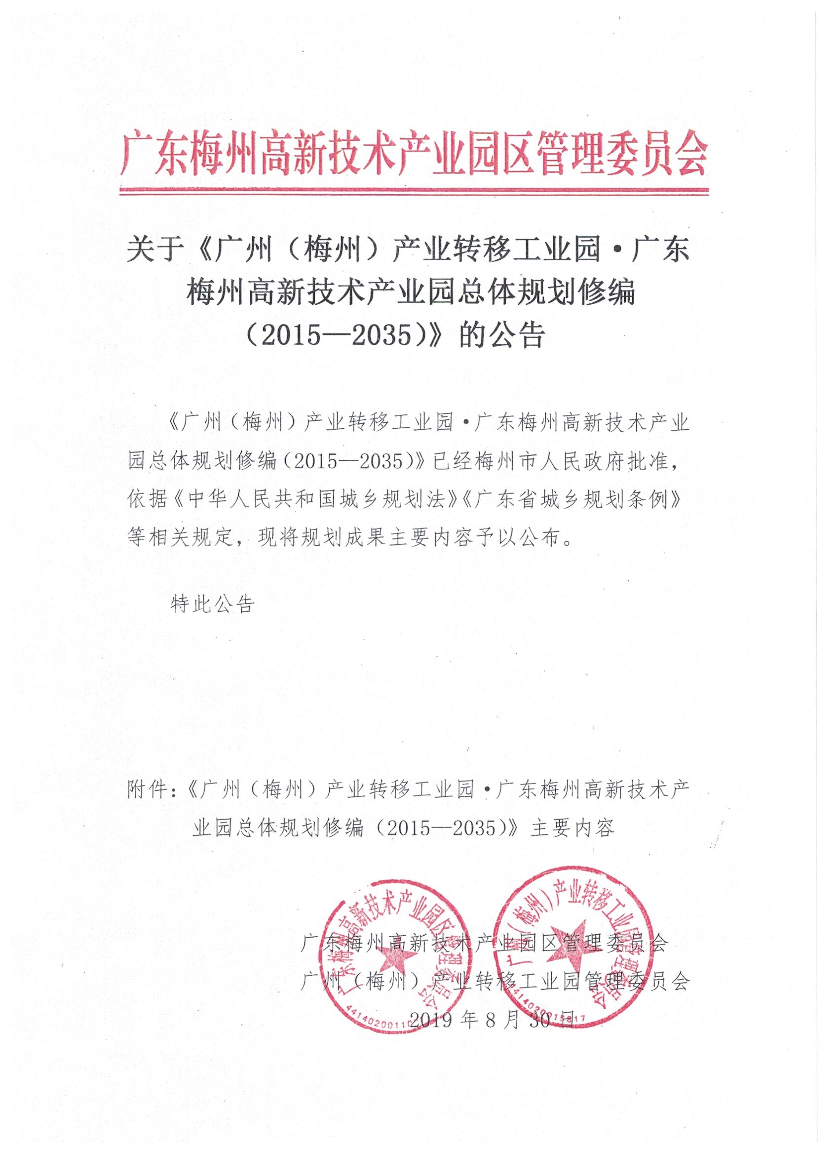 關於《廣州(梅州)產業轉移工業園·廣東梅州高新技術產業園總體規劃修編(2015-2035)》的公告