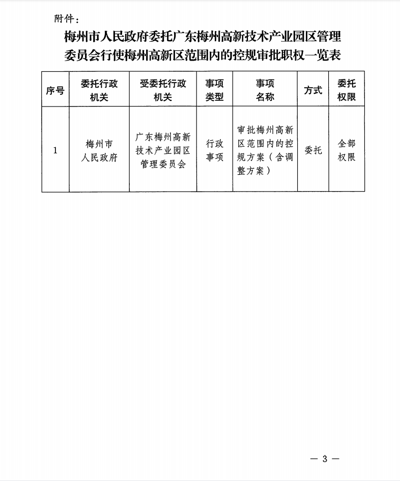 梅州市人民政府關於委托行使梅州高新區範圍內的控規審批職權的公告