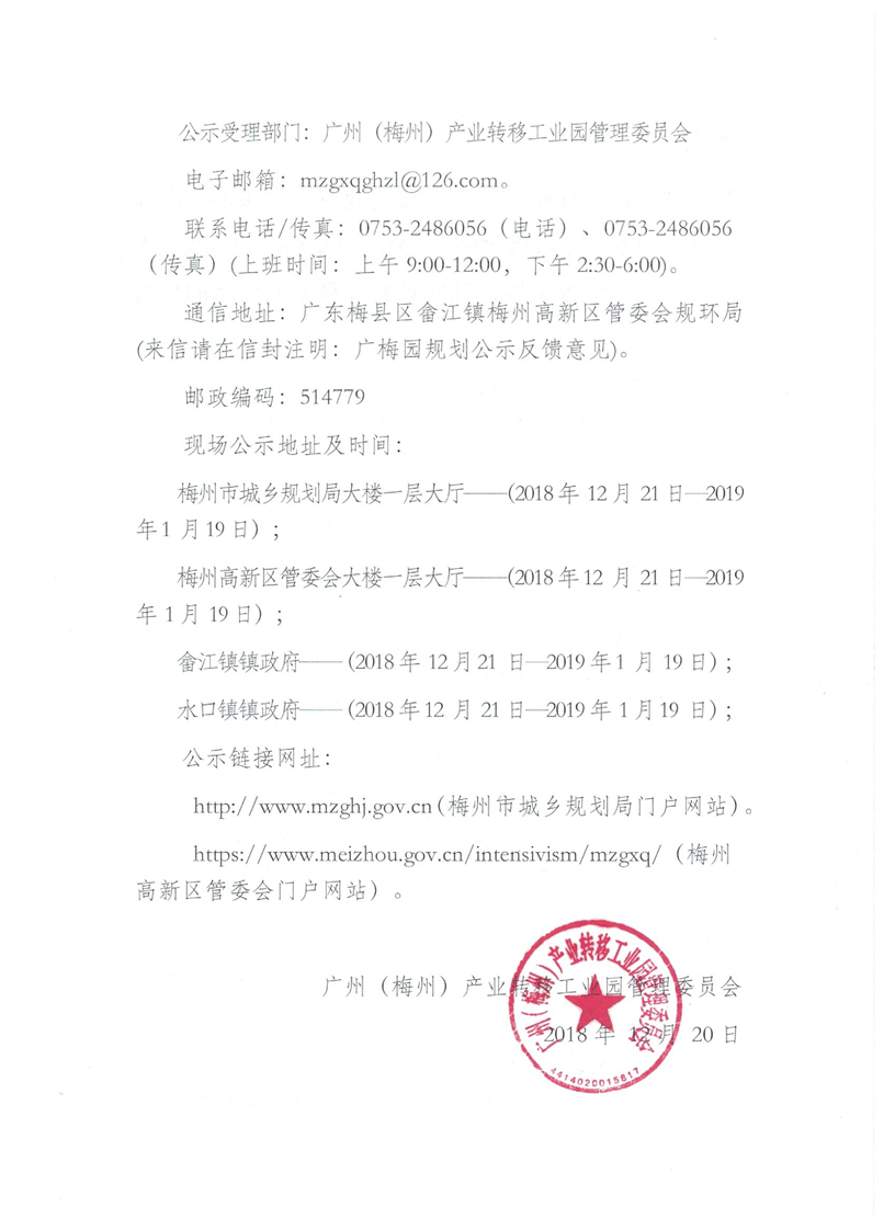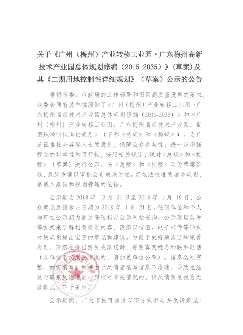 關於《廣州(梅州)產業轉移工業園·廣東梅州高新技術產業園總體規劃修編(2015-2035)》(草案)及其《二期用地控製性詳細規劃》(草案)公示的公告