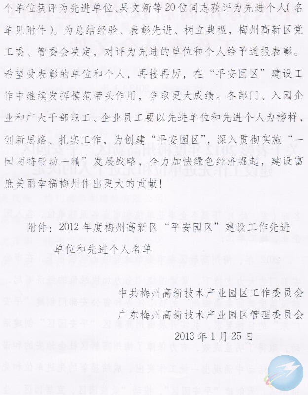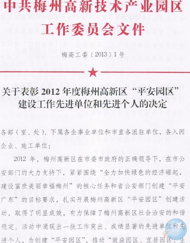 梅州市人民政府門戶網站 梅州市高新區 政策法規 關於表彰2012年度梅州高新區“平安園區”建議工作先進單