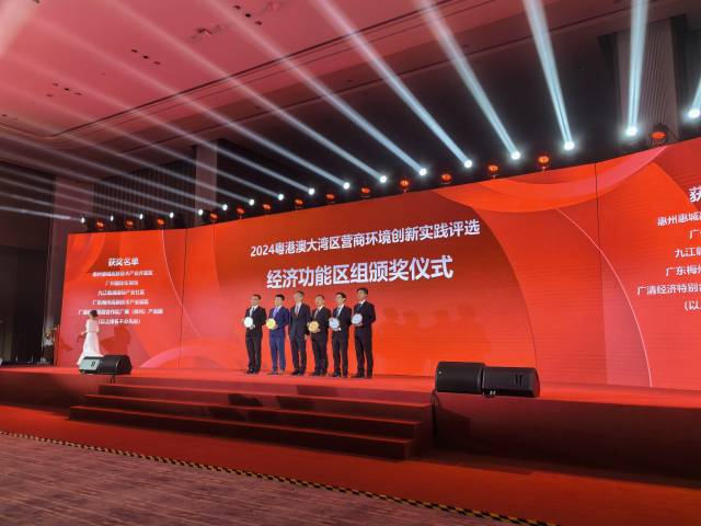 近日,第八屆廣東投資發展論壇(暨2024粵港澳大灣區營商環境創新實踐評選活動頒獎儀式)在廣州舉行。儀式上,廣東梅州高新技術產業園區(廣梅產業園)榮獲年度經濟功能區優秀獎。