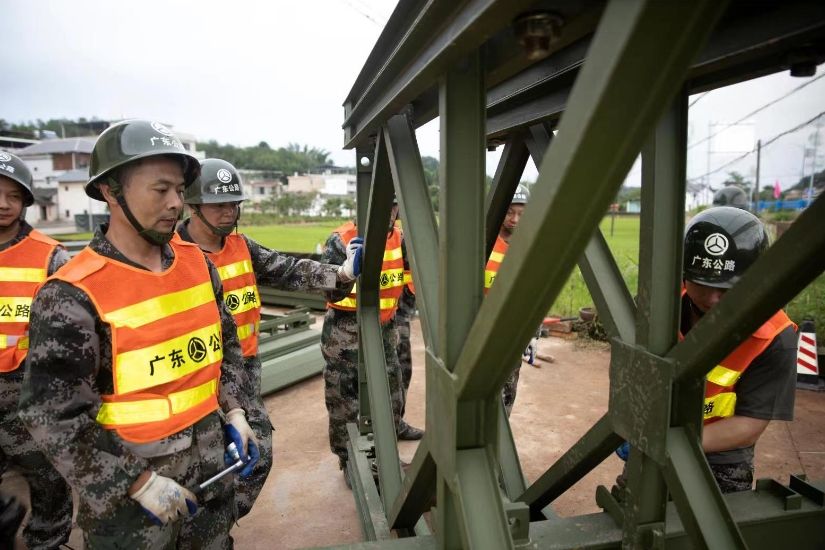 此次演練地點位於梅江區國道G206線南山橋處,因該橋拱圈出現大麵積裂縫超限,按照相關規定,需拆除重建。由於國道206線沿線車流量大,橋址周邊地理環境較差,繞道和新建便道均不適宜。為方便沿線人民群眾出行,保證過往車輛的正常通行,經相關部門綜合分析研判決定在原橋上遊架設保通鋼橋。10日下午,28名隊員在統一指揮下,各個環節有效銜接、有條不紊。經過大家齊心協力,11日,一組15米×1跨的321型裝備式公路鋼橋完成架設。12日、13日組織開展後續工作及集訓。