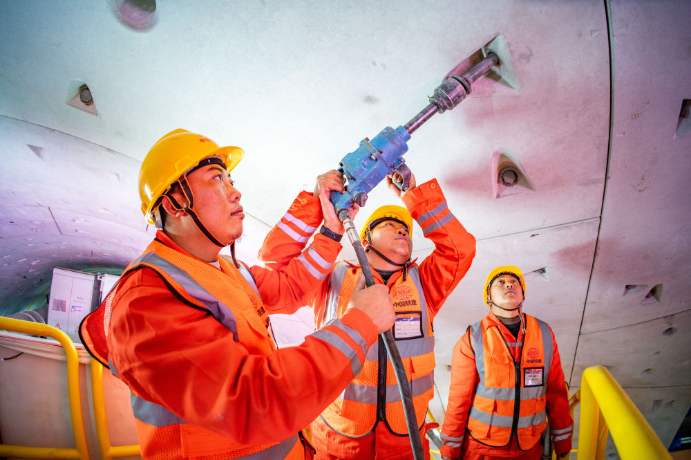 在中鐵十四局京唐城際鐵路運潮減河隧道內,施工人員在拚裝管片(2024年2月4日攝)。新華社發(中鐵十四局供圖)