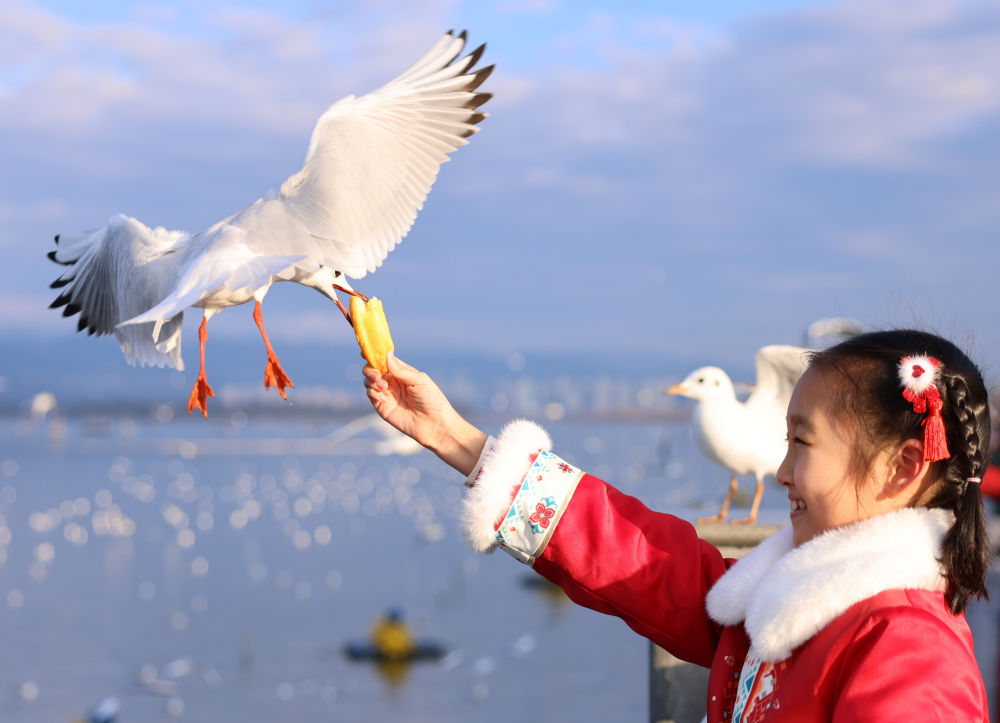 遊客在昆明滇池邊投喂紅嘴鷗(2024年1月17日攝)。新華社發(劉元嵩攝)