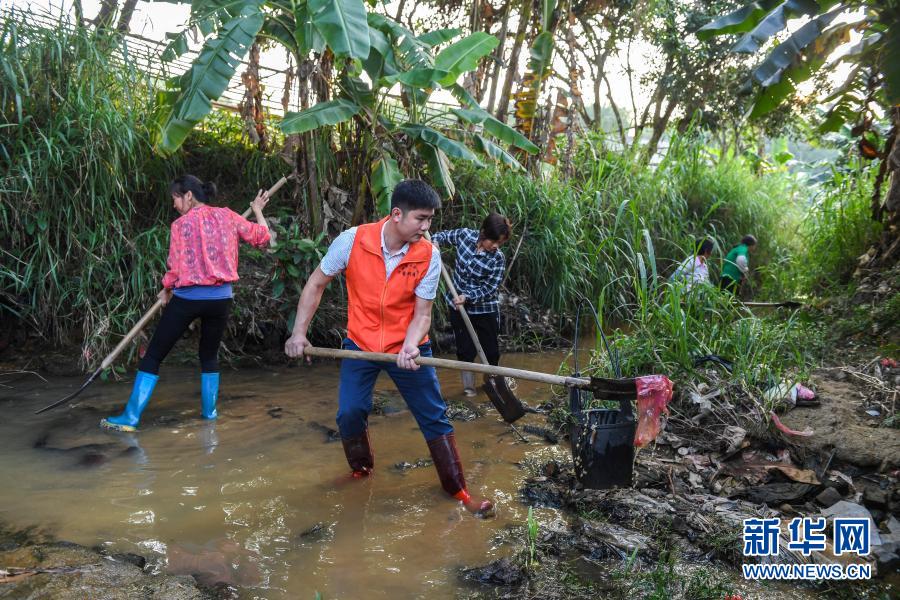 2020年5月2日,廣西興業縣小平山鎮金華村駐村第一書記董積有(左二)與村民一起清理河道中的淤泥和垃圾。新華社記者 曹禕銘 攝