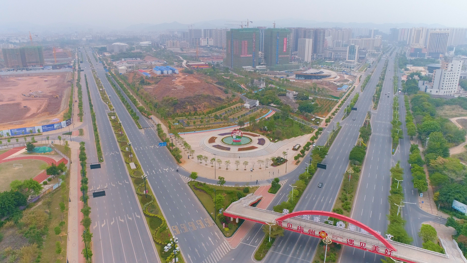 圖為江南新城地下綜合管廊項目建設的道路和綠軸花園廣場。(攝像:張琪達)