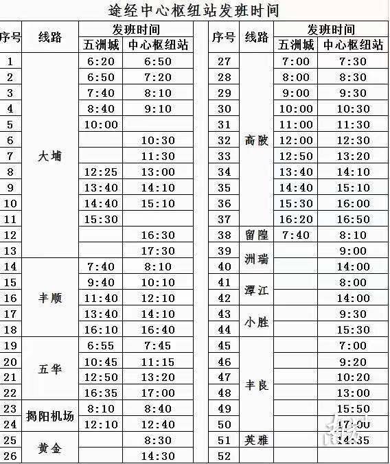 梅州市中心樞紐汽車站試營業後,屆時大埔、豐順等縣際班車將於中心樞紐站始發,部分廣州、深圳自營車(受當下疫情影響已停班)、揭陽機場專線將在中心樞紐站配客,前期預計每日發班51個班次,預計每月客流量1500人次。