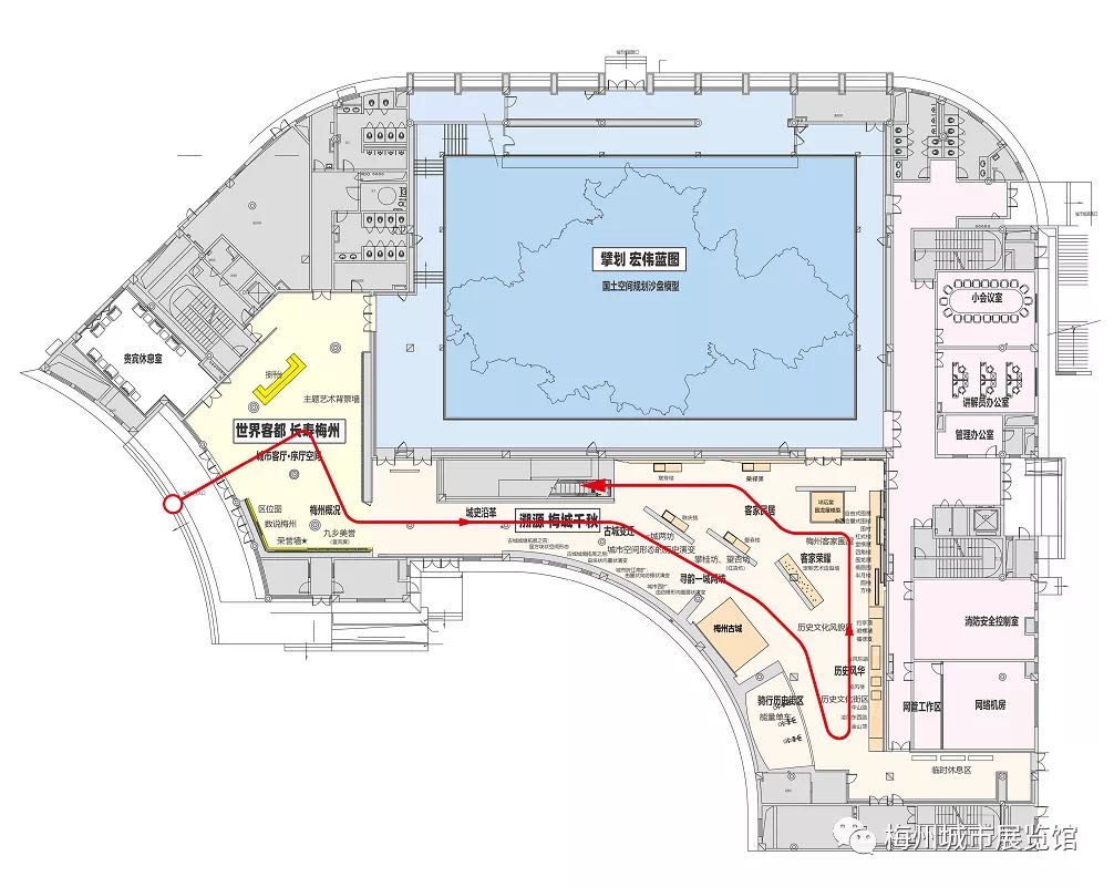 開放時間 周二至周日上午9:00至12:00,下午14:30至17:00。中午閉館設備維護。(國家法定節假日開館時間另行通知)開館日每天上午11:30後、下午16:30後停止檢票入館。 閉館時間 周一閉館(國家法定節假日除外)。 開放範圍 免費向社會公眾開放,12歲以下未成年人須由成年人陪護或集體組織方可入館參觀。 參觀方式 電子門票:請提前登錄“梅州城市展覽館”微信公眾號實名預約電子門票,每日可預約電子門票100張,約滿即止。 線下登記:請持本人有效身份證件,前往“服務台”實名登記(限年長者等特殊群體),每日限50人,登記時間為開放日09:00-17:00。 團體預約:疫情防控期間,暫停社會團體預約服務。 谘詢電話:0753-2383189(周二至周日09:00--17:00) 防控要求 1.根據相關工作指引,按限流75%的標準控製進館人數,將每日電子門票調整至100張,線下登記調整至50人,超過瞬時承載量將采取限客流措施。 2.請按預約時段入館參觀,提前出示健康碼和行程,並配合體溫檢測,如體溫≥37.3℃或有其他不適症狀,謝絕入館。 3.參觀期間請全程佩戴口罩,保持1米以上安全距離。 4.疫情防控期間,展廳觸摸類展項(能量單車、信息瀑布、互動飛屏)暫停開放與體驗。 5.請自覺遵守防控措施,如需幫助,請與現場工作人員聯係。 6.疫情防控期間,對拒不配合及擾亂秩序者,由工作人員協調公安部門依法處置。 7.以上規則與措施將根據防疫動態實時調整,請關注公眾號最新公告。 注意事項 1.請自覺接受安檢。嚴禁攜帶易燃、易爆、管製械具等危險物品和寵物、橫幅、標語、廣告牌、傳單等宣傳物品入館。 2.請自覺遵守館內提示類標識標牌,請勿在展館內飲食、吸煙、大聲喧嘩和觸摸裸露模型或展品,如有損壞,照價賠償。 3.重物、大件物品及容易損壞展館設備的物品請至前台谘詢辦理寄存,貴重物品請自行保管。 4.未經允許,請勿使用專業攝影攝像器材(包括自拍杆、三腳架、閃光燈)等在展廳內拍照。 5.為避免影響他人參觀,禁止任何團隊和個人在館內使用擴音設備進行非正式講解。 6.請自覺遵守展館的規章製度,文明有序參觀。如遇緊急突發情況,須聽從工作人員統一指揮。