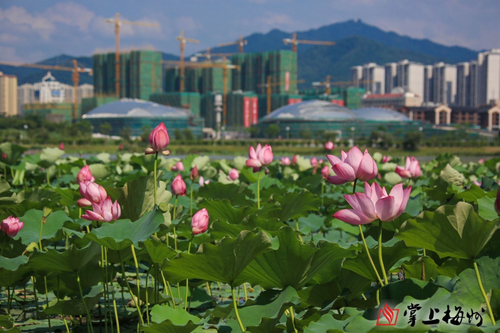 劍英湖公園內,荷花正開得嬌豔。 (高訊 攝)