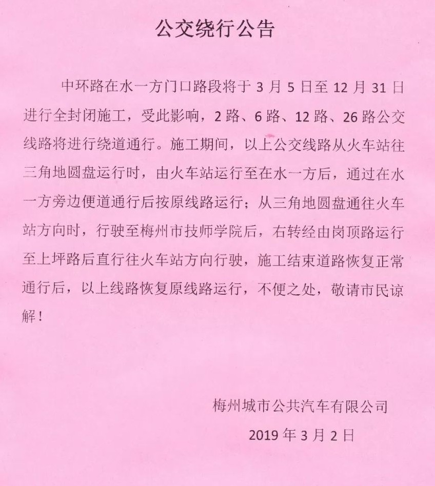 (三)中環路公交線路調整方案,以梅州市公共汽車公司公告為準。