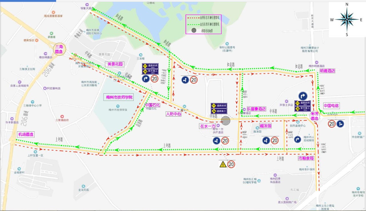 經與嘉應新區管委會、市交警支隊、市住建局及梅江區三角鎮政府等單位共同研究,確定了中環路道路管廊施工期間的交通疏解方案。現將道路節點封閉時間和繞行措施通告如下: