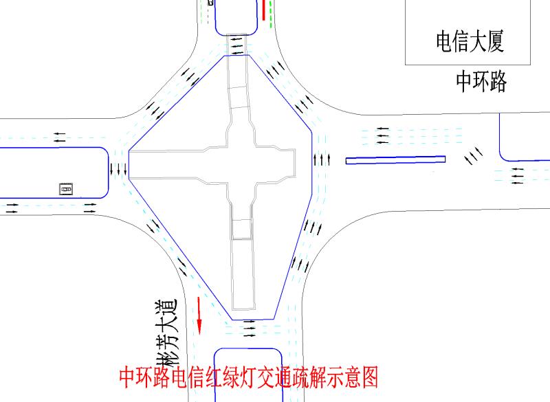 中環路三角環島至電信紅綠燈路段實施分段圍蔽施工。第一階段在道路中間圍蔽,兩側通行,其中在水一方門口段全封閉施工,車輛及行人需繞行;第二階段在道路兩側分邊單邊圍蔽,單邊雙向通行。