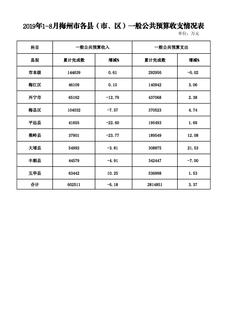 附:2019年1-8月梅州市各縣(市、區)一般公共預算收支情況表