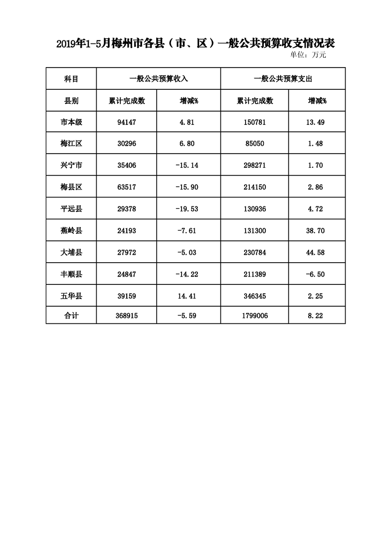 附:2019年1-5月梅州市各縣(市、區)一般公共預算收支情況表