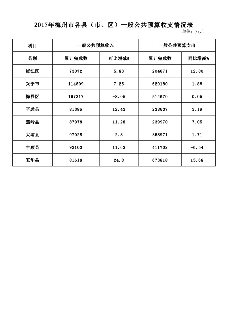 附:2017年1-12月梅州市各縣(市、區)一般公共預算收支情況表