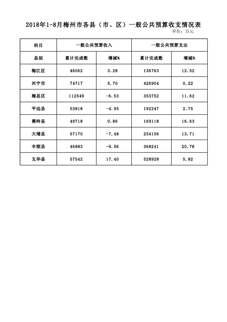 附:2018年1-8月梅州市各縣(市、區)一般公共預算收支情況表