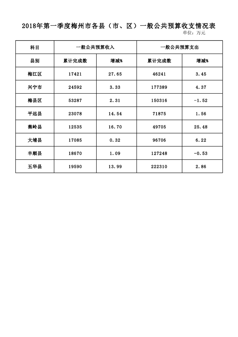 附:2018年第一季度梅州市各縣(市、區)一般公共預算收支情況表