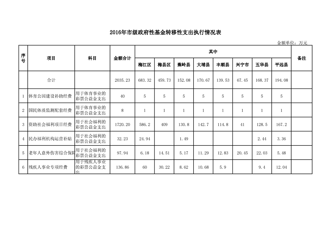 梅州市人民政府門戶網站 梅州市財政局 2016年度 2016年市級政府性基金轉移性支出執行情況表