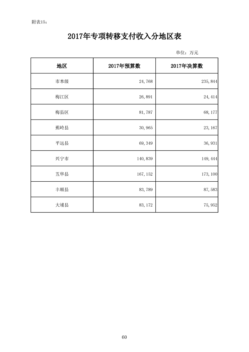 梅州市人民政府門戶網站 梅州市財政局 2017年度 附表15:2017年專項轉移支付分地區表