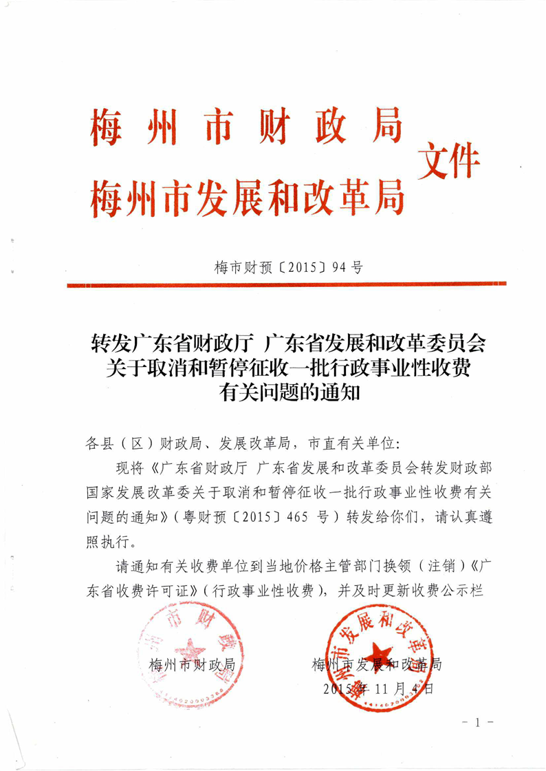 梅州市人民政府門戶網站 梅州市財政局 行政事業性收費及政府性基金 轉發廣東省財政廳 廣東省發展和改革委員會關於取消和暫停征收一批行政事業性收費有關問題的通知 梅市財預[2015]94號