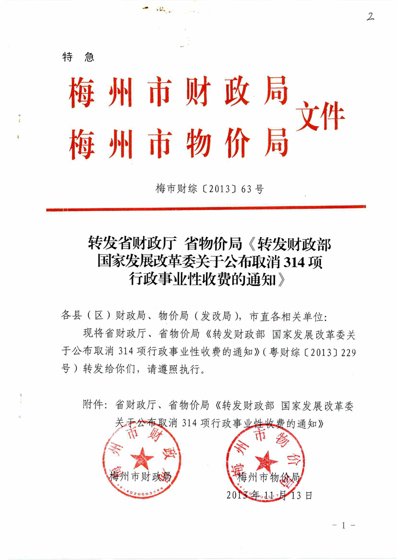 梅州市人民政府門戶網站 梅州市財政局 行政事業性收費及政府性基金 轉發省財政廳 省物價局《轉發財政部 國家發展改革委關於公布取消314項行政事業性收費的通知》 梅市財綜[2013]63號