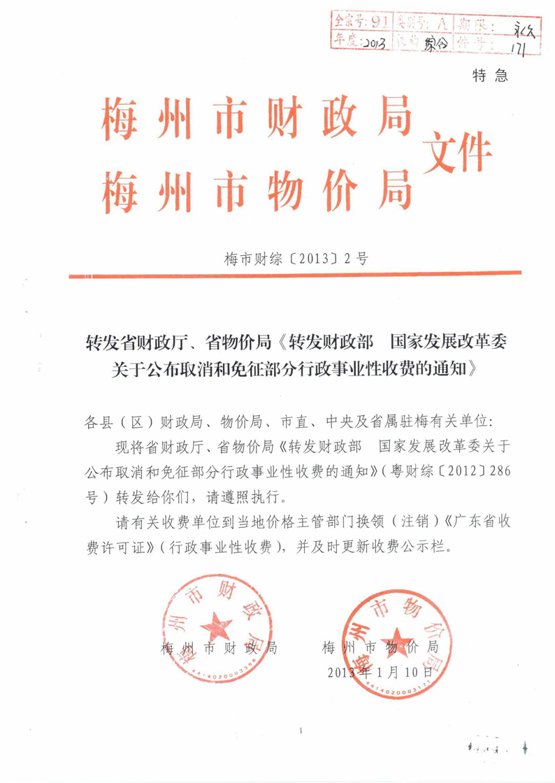 梅州市人民政府門戶網站 梅州市財政局 行政事業性收費及政府性基金 轉發省財政廳 省物價局《轉發財政部 國家發展改革委關於公布取消和免征部分行政事業性收費的通知》梅市財綜[2013]2號